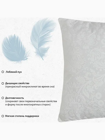 - Наполнитель из искусственного лебяжьего пуха: легкий, гипоаллергенный и исключительно мягкий, он прекрасно держит форму.