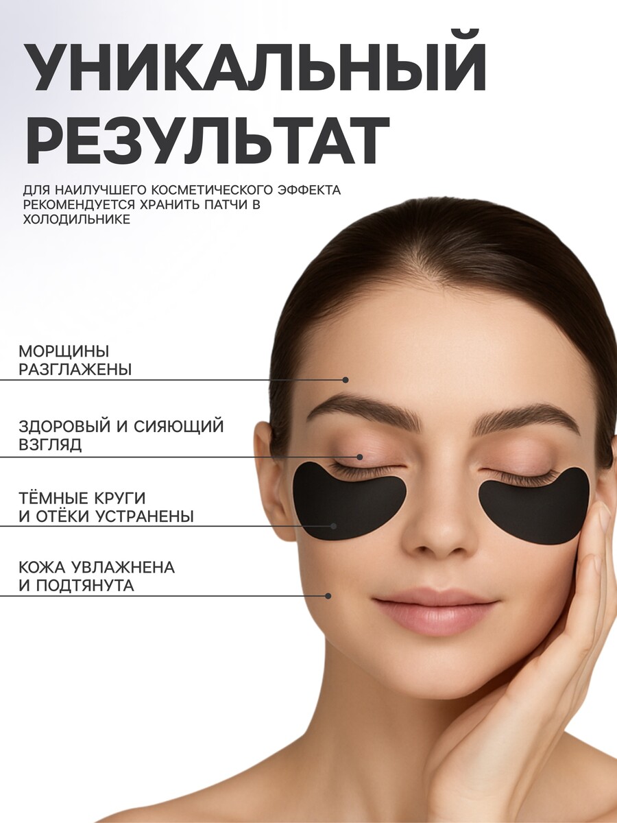 Гидрогелевые патчи для глаз с бамбуковым углем 60 шт.. Гидрогелевые патчи с бамбуковым углем придадут сияние и упругость коже вокруг глаз. Патчи плотно прилегают к коже, наделяя ее полезнми веществами, входящими в состав. Бамбуковый уголь - самый полезный и уникальный активированный уголь, обладает высокими очищающими, увлажняющими и бактерицидными свойствами. Бамбуковый уголь превосходно выводит токсины и загрязнения из пор, с которыми не могут справиться обычные очищающие средства. Средство подходит для любой кожи. Способ применения: извлеките патчи с помощью лопаточки и нанесите на очищенную кожу вокруг глаз. Снимите через 15–20 минут и сделайте легкий массаж подушечками пальцев. Для сохранения эффекта храните упаковку с патчами в холодильнике. Внимание: только для наружного применения. При попадании средства в глаза или появлении дискомфорта, немедленно прекратите использование и обильно промойте глаза и область вокруг глаз водой. Возможна индивидуальная непереносимость компонентов состава. Хранить в недоступном для детей месте. Состав: вода, пропиленгликоль, глицерин, хондрус курчавый, мика, гидроксиэтилцеллюлоза, аморфофаллус коньяк, метилпарабен, аллантоин, CI 77266, бамбуковый уголь, калия хлорид, диазолидинил мочевина, каприлоил гидроксамовая кислота, ПЭГ-40 Гидрогенизированное касторовое масло, динатрий ЭДТА, ароматизатор, глицерил каприлат, йодопропинил бутилкарбамат, коллаген.