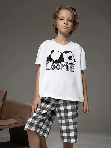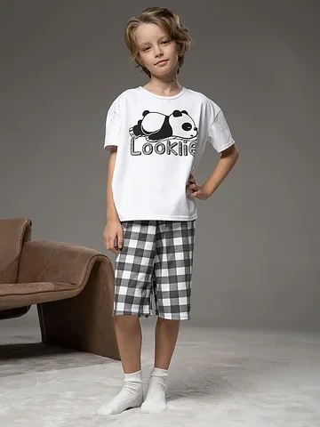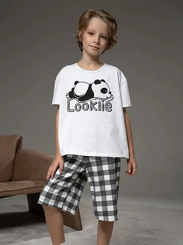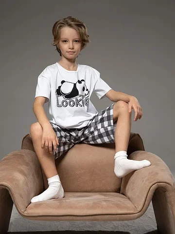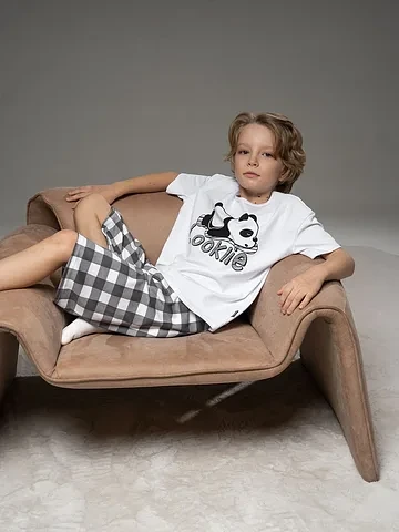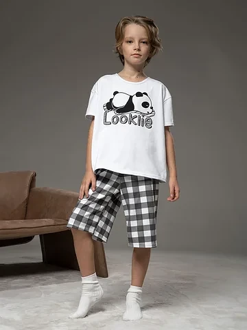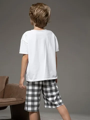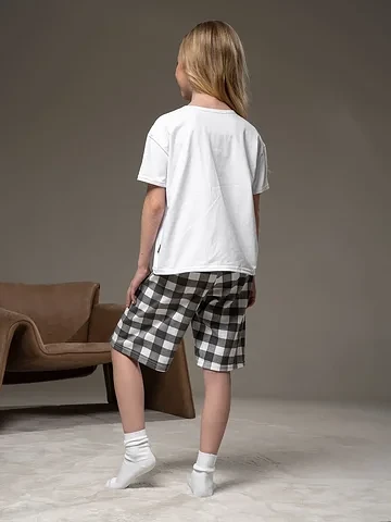 Пижама из интерлока белого цвета свободного силуэта . Состоит из футболки и шорт Футболка с расширенной линией плеча, округлой горловиной и короткими рукавами. Удлиненные шорты с цельнокроенным поясом на резинке без бокового шва.