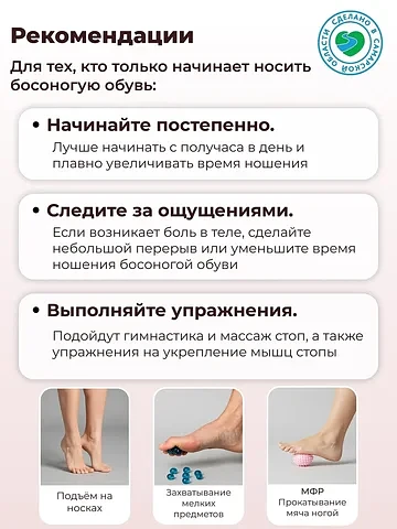 - Укрепление мышц: Ходьба в такой обуви активизирует мелкие мышцы и связки стопы, которые обычно не работают в жесткой обуви. Это естественная тренировка, укрепляющая свод стопы и предотвращающая плоскостопие.