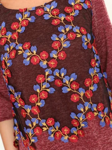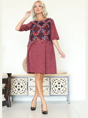 Чудесное платье А-силуэта из трикотажного полотна красного цвета. Круглый вырез изделия обработан внутренней обтачкой. Платье с втачными рукавами длиной три четверти. Перед изделия украшен кружевом. В боковых швах платья — карманы.