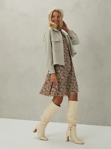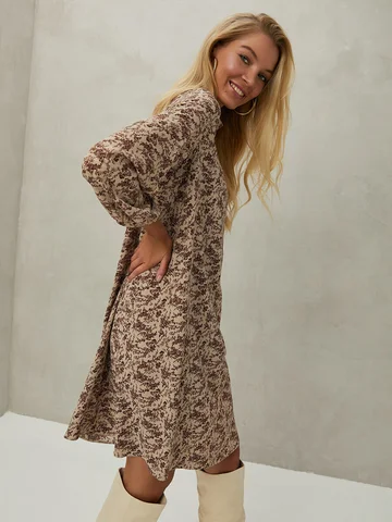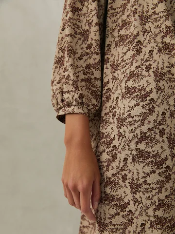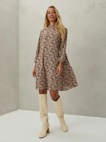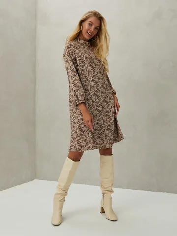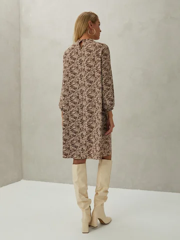 Бежево-коричневое платье длиной до середины колена, с воротником-стойкой и длинными широкими рукавами настолько легкое, что почти не ощущается на теле. Расклешенный силуэт создает динамику материала при каждом движении. Приталить силуэт можно кожаным пояском. Платье с застежкой на пуговицу сзади, выполнено из непрозрачного креп-шелка, состав которого позволяет модели не мяться в течение всего дня.