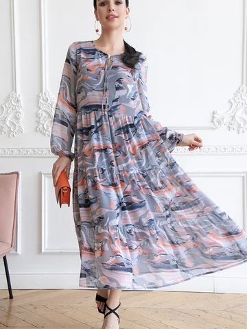 Платье свободного силуэта из шифона. Платье на подкладе. Втачные длинные рукава. Платье без застежки.