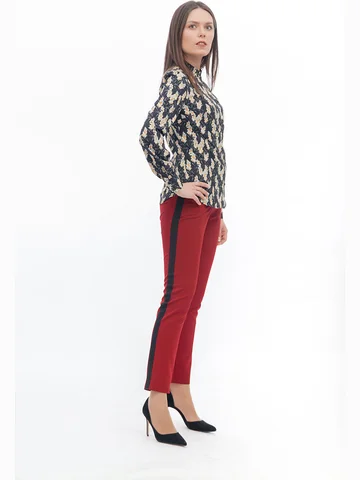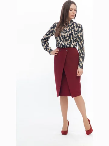 Модель приталенного силуэта из тонкой блузочной ткани, отлично впишется в гардероб современной женщины. Блузка с воротником-стойкой и застежкой по переду на петли и пуговицы. Длинные втачные рукава собраны снизу на манжеты, с застежкой на пуговицу. Низ блузы имеет фигурный вырез.На фото блузка представлена с брюками Бр-26/3 и юбкой Ю-235