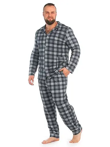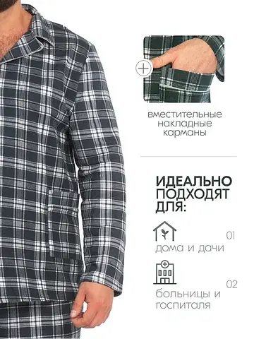 Мужская пижама со штанами — это трикотажный домашний пижамный комплект, состоящий из рубашки с длинными рукавами и свободных брюк. Рубашка застегивается на пуговицы, имеет красивый отложной воротник, по бокам накладные глубокие карманы. Прямые брюки свободного кроя, с удобной посадкой. Комплект изготовлен хлопка (футер без начеса) с добавлением полиэстера. Пижама мужская со штанами с длинным рукавом из хлопковой ткани не садиться, не линяет и не вытягивается. В летнюю погоду в таком костюме не жарко, а зимой он сохраняет тепло и уют. Ночная пижама не стесняет движений, ткань мягкая, приятная к телу. Пижамный брючный костюм двойка может служить комплектом для дома и отдыха, пижамой, нарядом для пижамной вечеринки, а также незаменимы в сложных жизненных ситуациях, как одежда для больницы. Благодаря натуральному составу ткани в нем будет комфортно и удобно провести весь день, а ночью костюм станет гарантией спокойного и крепкого сна. Классическая пижама с рубашкой и брюками идеально подойдет как для мужчин, так и подростков. Данная модель подходит для мужчин с высоким и средним ростом и любым типом фигуры. Классический фасон, свободный крой и широкий размерный ряд идеально подходит для стройных и полных мужчин. Пижама — это не только удобный и стильный элемент гардероба, но еще и отличный подарок на 14 и 23 февраля. Домашняя пижама включает в себя штаны и рубашку с накладным карманом свободного кроя. Для сохранения первоначальных свойств на долгое время рекомендуем бережно стирать комплект домашней одежды как в режиме ручной, так и в режиме машинной стирки при максимальной температуре 30 градусов. Отлично подойдет в качестве домашней одежды и для сна, а также незаменима в сложных жизненных ситуациях, например как больничная пижама или пижама для больницы.