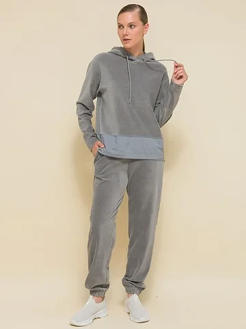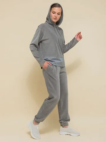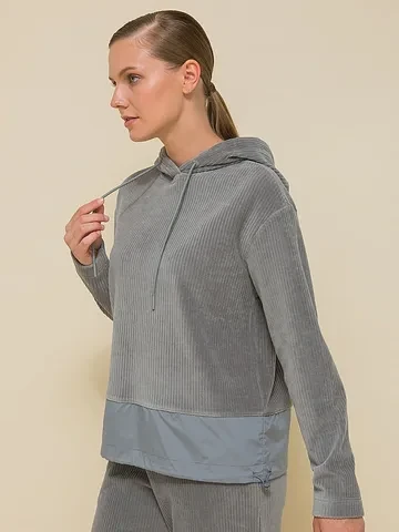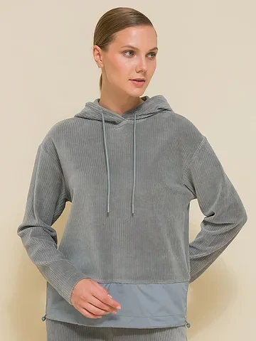 Женская плюшевая толстовка со вставкой из гладкой курточной ткани. Сочетание материалов с разной фактурой — актуальный тренд сезона. Свободная толстовка из трикотажного вельвета со спущенным плечом подарит вам ощущение комфорта и уюта. Худи с капюшоном на кулиске, защитит от холода и ветра. По низу изделия также есть кулиска — ее можно затянуть и получится кроп-толстовка. Худи однотонное, без принта. Неприхотливо в уходе. В составе ткани преобладает высококачественый хлопок — толстовка мягкая и прекрасно пропускает воздух. Полиэстер и эластан обеспечивают формоустойчивость надолго. Модель представлена в двух цветах. Черная толстовка — практичный, базовый вариант. Серое худи также универсально. Размерный ряд: XS (42): S (44): M (46): L (48): XL (50). Толстовка подходит женщинам, девушкам, девочкам-подросткам. Она идеальная для работы, учебы, отдыха, перелетов, прогулок. А также может быть использована в качестве домашней одежды. Худи можно носить осенью и весной (демисезон), зимой и в прохладную погоду летом. Такую толстовку легко комбинировать с разными моделями брюк. Она станет замечательным подарком сестре, подруге или маме на Новый год или любой другой праздник.