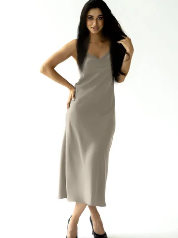 Струящееся легкое женское летнее платье на бретельках слегка свободное, имеет А-силуэт, а значит, подходит для всех типов фигур. Сшито из шелковистой плотной ткани – японский шелк, который не просвечивает. Оно на тонких лямках и с вырезом качели подчеркнет зону декольте.