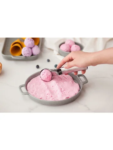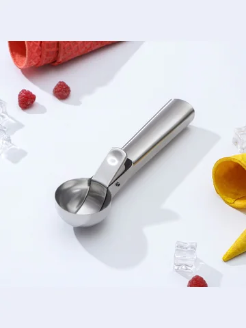 - Специальный прибор из нержавеющей стали позволяет удобно черпать замороженную массу и выкладывать ее аккуратными шарами.