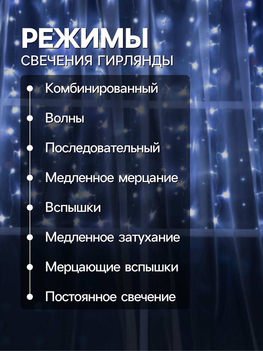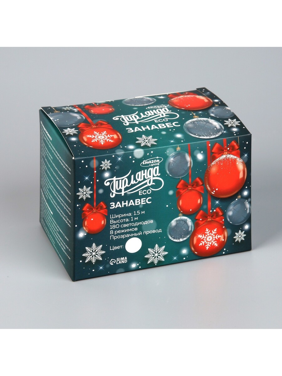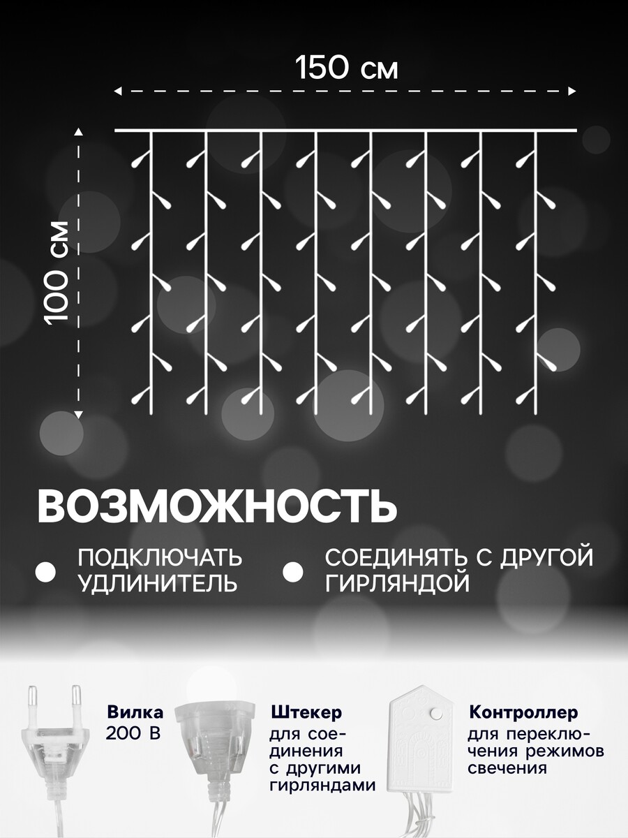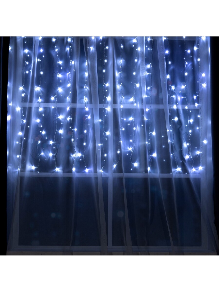 Гирлянда «Занавес» 1.5×1 м, IP20, прозрачная нить, 180 LED, свечение белое, 8 режимов, 220 В.