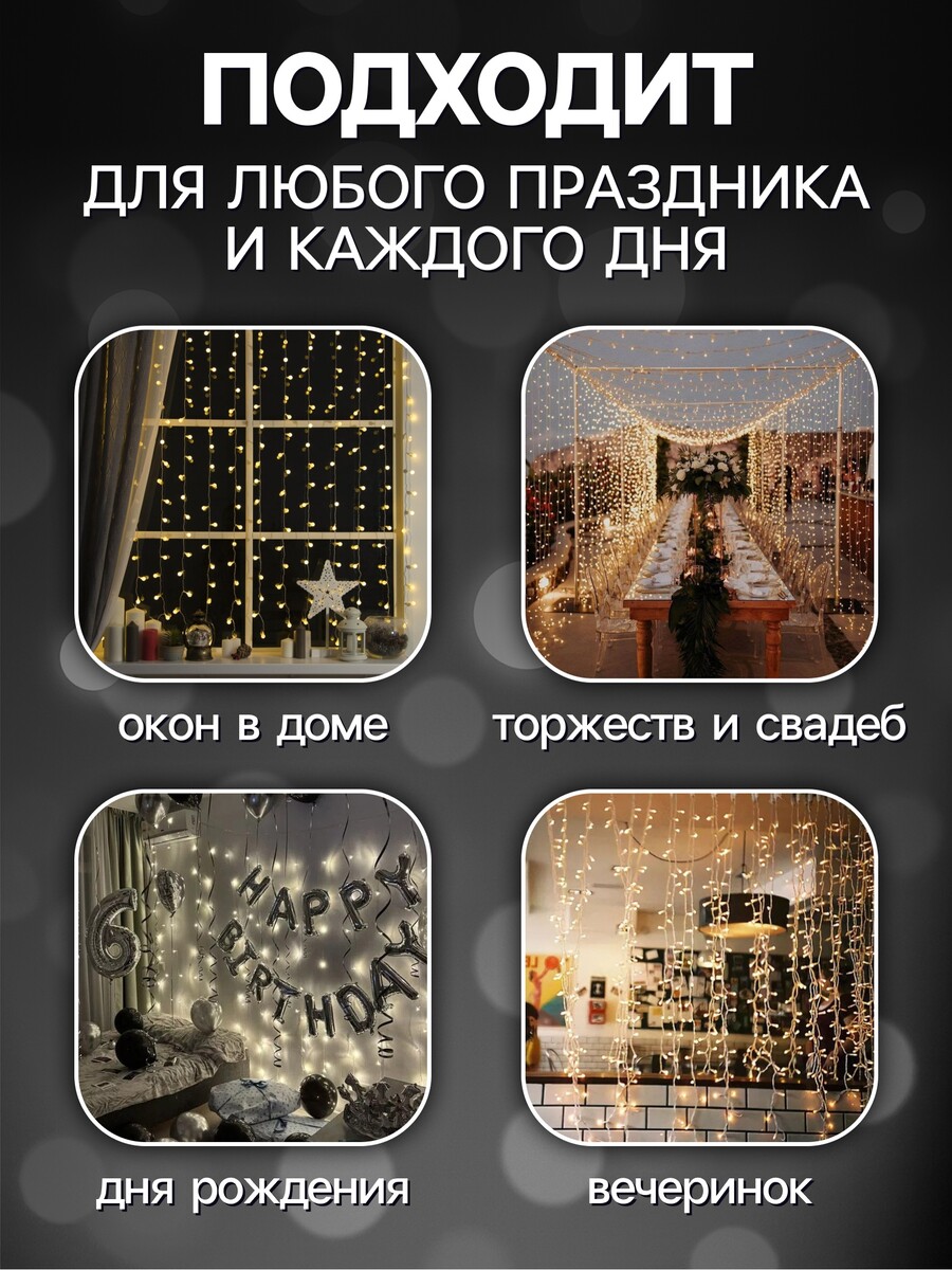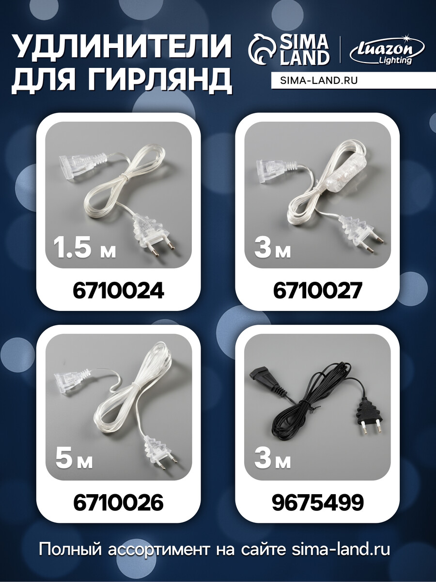 Настройки вашего экрана влияют на отображение фотографии, поэтому реальный цвет товара может незначительно отличаться от фото., Оттенок товара может отличаться в зависимости от партии поставки., Длина гирлянды указана без учета длины шнура питания — измеряется от первого до последнего светодиода, не включая провод., Гирлянда поставляется в скрученном виде, для достижения заявленного размера изделия, провода необходимо раскрутить
