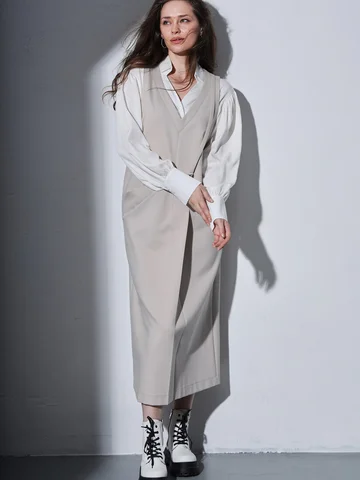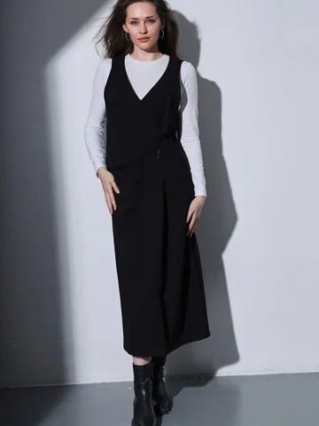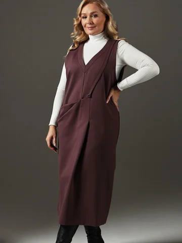 Удлиненный сарафан прямого силуэта выполнен из плотной ткани "джерси". Оригинальное решение полочки, в складке расположен карман. Сзади разрез. Длина по среднему шву спинки от 124 до 127 см. Прекрасно скрывает все недостатки фигуры в больших размерах.