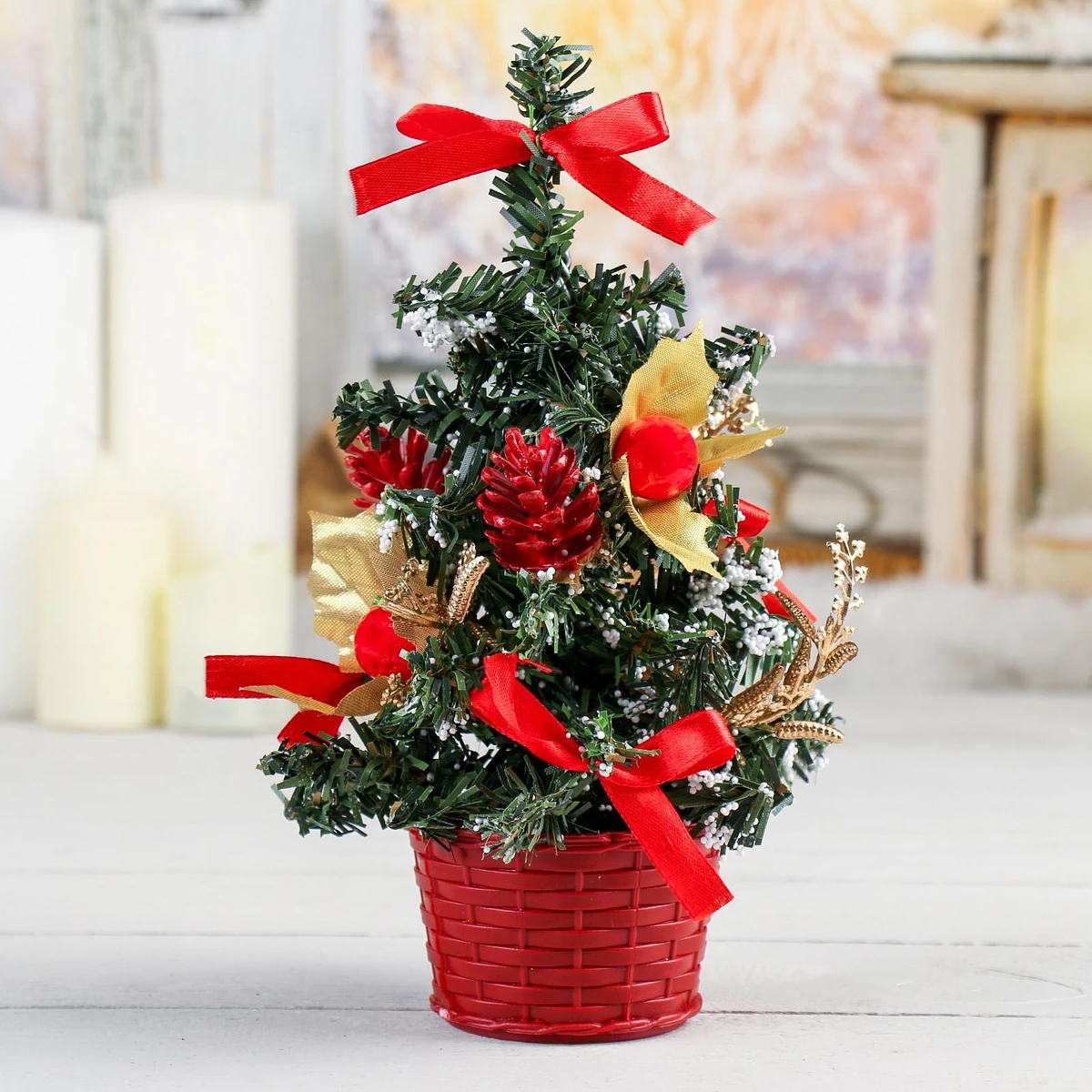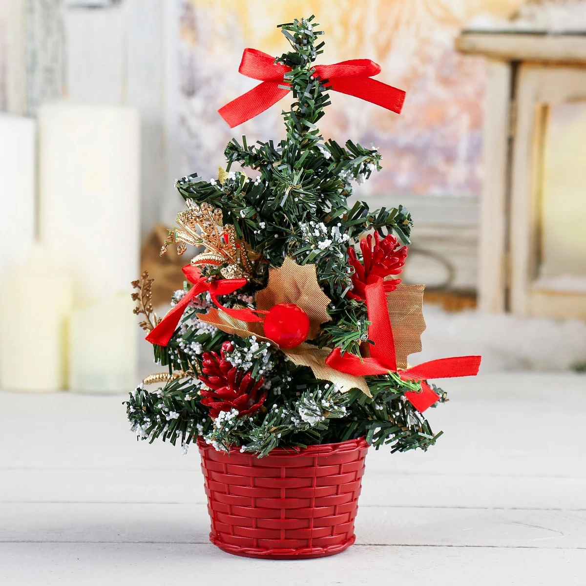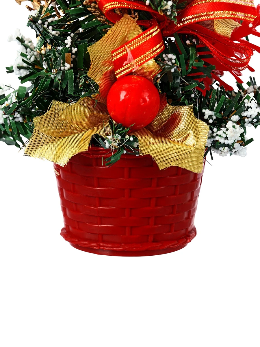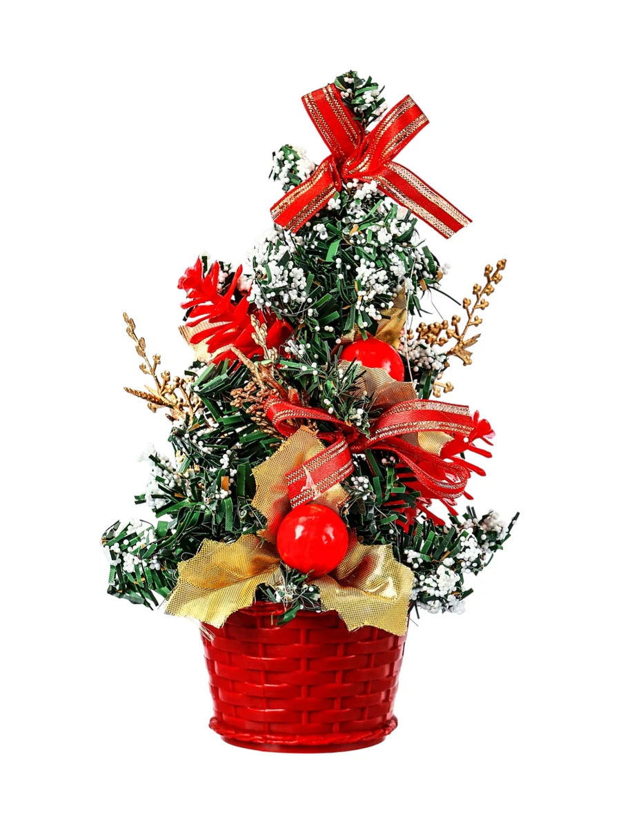 Праздничный акцент Эта миниатюрная елка добавляет нотки зимнего волшебства и наполняет пространство теплом и радостью новогодних дней. Она станет не только украшением вашего интерьера, но и символом семейных встреч и дружеских посиделок в это особенное время года. Разместив ее на видном месте, вы создадите атмосферу уюта и тепла, которая будет радовать вас и ваших близких. Кроме того, такая елка может стать замечательным подарком для друзей и родных, добавляя каплю волшебства в их новогодние праздники. Ее компактные размеры и универсальный дизайн делают ее отличным вариантом для любого случая, а яркие красные банты и зеленая хвоя создают праздничное настроение, которое будет радовать глаз и поднимать дух в течение всего зимнего сезона.