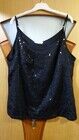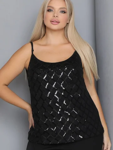 Сверкающий топ двухслойный по переду из сочетания трикотажного полотна и пайеточной ткани на регулируемых бретелях. Низ ровный, без разрезов.