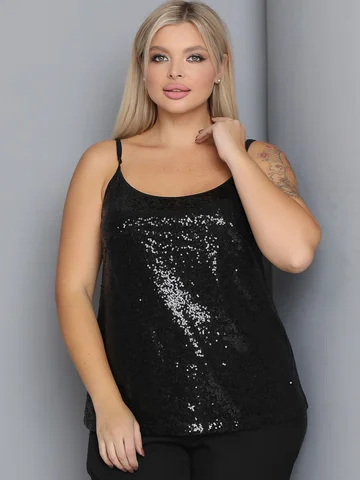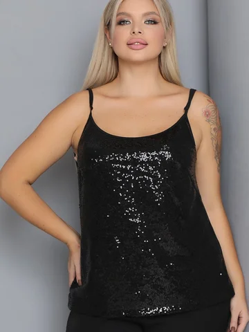 Сверкающий топ, двухслойный по переду, из сочетания шелка и пайеточной ткани на регулируемых бретелях. Низ ровный, без разрезов.