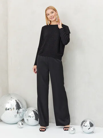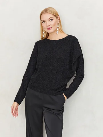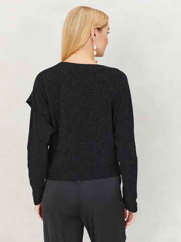Черный джемпер из тонкого высокоэластичного трикотажа,с легким мерцанием, придаст немного блеска вашему праздничному образу. Горловина-лодочка, спущенная линия плеч, мягкая драпировка на левом плече. Благодаря эффектному крою, модель отлично сидит на фигуре, не сковывает движения и не мнется. Такая вещь проста в уходе, не требует утюжки после стирки и не теряет форму в течение всего дня. На фото джемпер представлен с брюками Б-900 АЧ(О3).