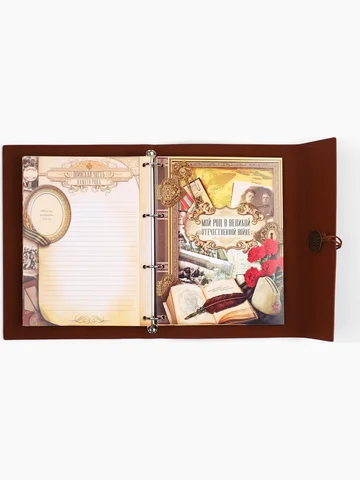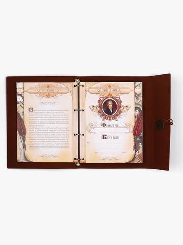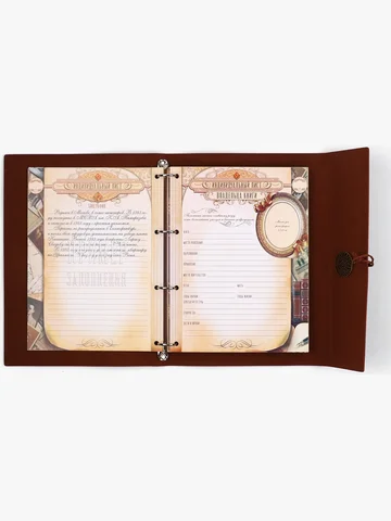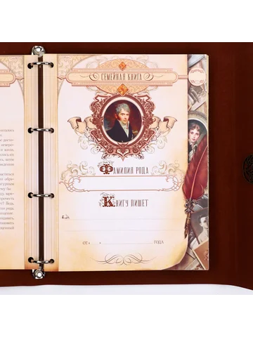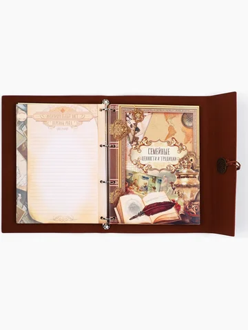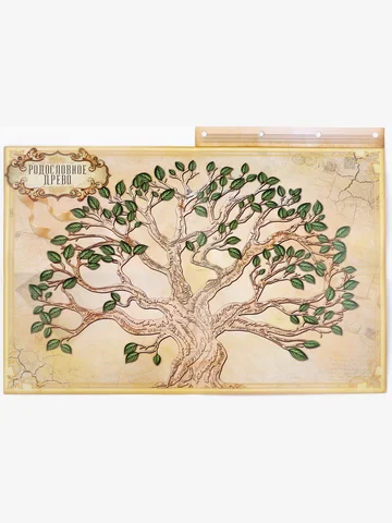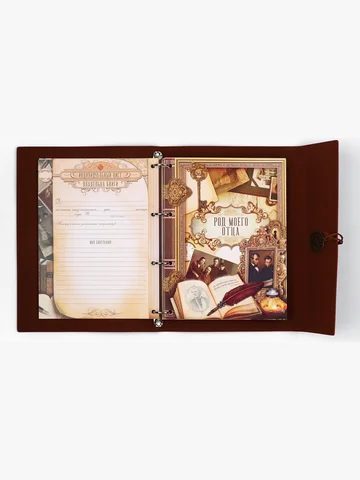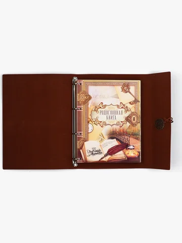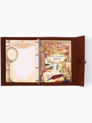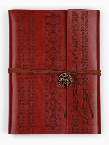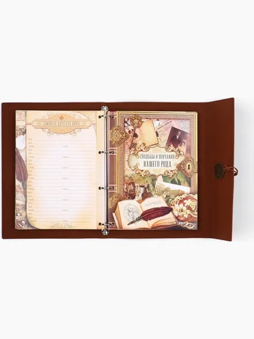 Родословная книга «Наш род», 56 листов, коричневый, 35×23.5 см. Семейные традиции — самое ценное, что есть в жизни человека. Кто из нас не хочет оставить память о себе и своих близких будущим поколениям? Ведь история может быть поводом для гордости! Для создания летописи вам пригодится наша родословная книга. Родословная книга на кольцах в переплете из кожзама содержит 65 листов, лист генеалогического древа формата А2 и лист наклеек для него. Листы состоят из мелованного картона плотностью 250 гр. Структура книги: