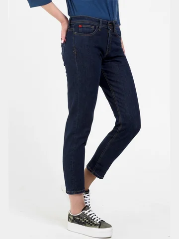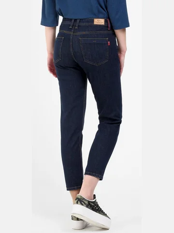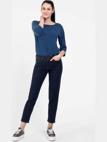 Женские модные джинсы с пятью карманами. Посадка Boyfriend fit. Для улучшения посадки по талии сделан подкройной пояс из 2-х частей. Застежка на молнии. Высокая посадка по талии, зауженные к низу, укороченной длины. Боковой шов "в разутюжку". Выполнены из слабоэластичной ткани denim comfort stretch. Темная стирка без потертостостей спереди и сзади. Параметры указаны для размера 28. Длина внутреннего шва для роста 32 - 69, 0 см.