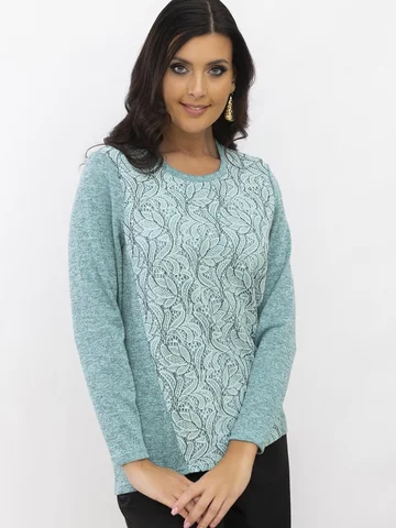 Блуза свободного силуэта с круглым вырезом. По переду и спинке рельефы. Деталь переда декорирована гипюром в цвет изделия. Линия плеча по плечевой точке. Рукав длинный. Линия низа спинки слегка ниже линии низа переда. Длина изделия по спинке 71-73 см. Обращаем внимание, что рост модели 180см. Ткань приятная, мягкая, легко драпируется. Красивая блуза от AhaLodensa для базового гардероба. Осенняя коллекция.