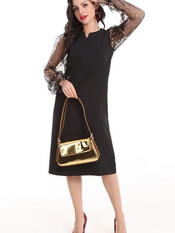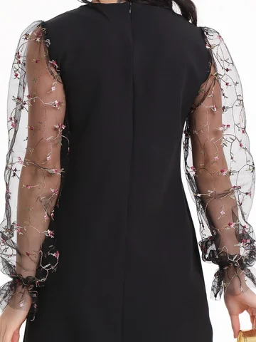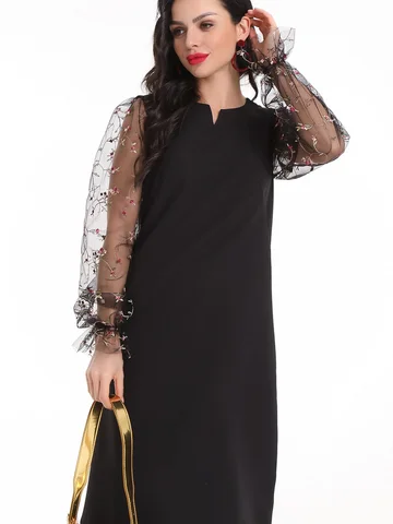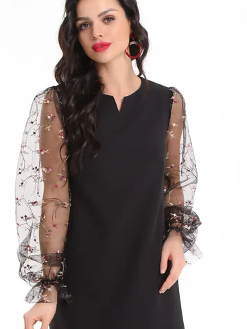 Красивое платье А-силуэта трапеция из костюмной ткани. Горловина переда оформлена фигурным вырезом. Рукава втачные из шифона. В среднем шве спинки застежка на потайную молнию.
