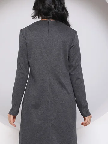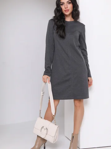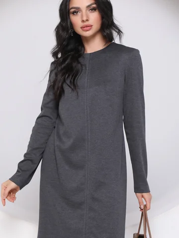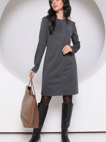 Трикотажное уютное платье полуприлегающего силуэта с вытачкой из середины шва. Длинный втачной рукав, молния в среднем шве спинки, по середине переда шов отстрочен.
