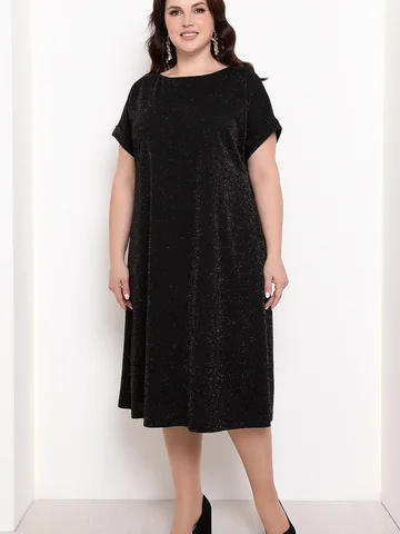 Платье женское А-образного силуэта, из трикотажного полотна с люрексом, с карманами в боковых швах.Горловина круглая, рукав цельнокроенный, короткий, на притачной манжете.Основной цвет - черный.