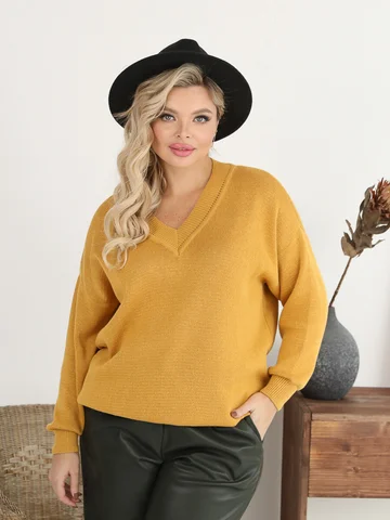 Эффектный джемпер свободного силуэта горчичного цвет. Джемпер выполнен в технике «ручного вязания» из натуральных хлопковых нитей. V-образный вырез изделия обработан двусторонней лицевой бейкой. Низ изделия и втачные рукава обработаны манжетами, выполненные в технике «резинка».