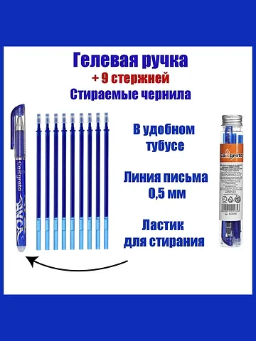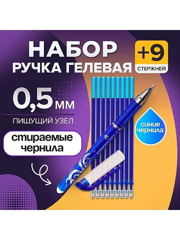 Набор ручки со стираемыми стержнями (9 штук) Calligrata, гелевая, узел 0.5 мм, синие чернила. Этот комплект — основа для долгосрочного использования стираемых ручек. Вы получаете одну эргономичную ручку и девять запасных стираемых стержней к ней. Такой подход избавляет от необходимости покупать новый корпус каждый раз и помогает экономить. Это разумный выбор для тех, кто уже оценил удобство тонкого стираемого письма и хочет обеспечить себя расходными материалами надолго. Состав комплекта