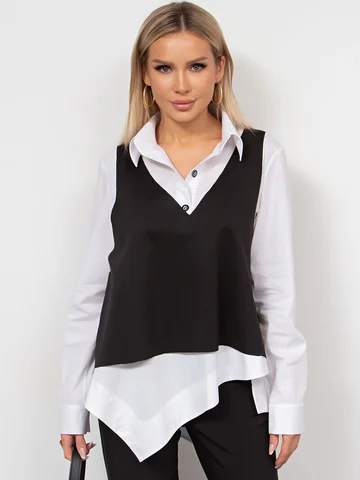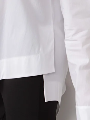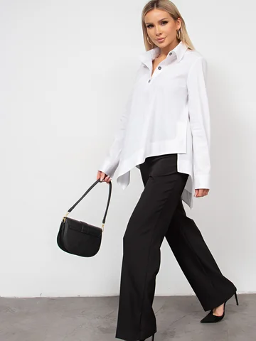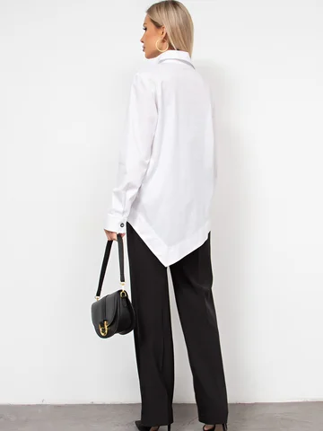Стильная рубашка свободного кроя. Втачной длинный рукав, оканчивается притачной манжетой. Горловина оформлена классическим воротником на стойке, переходящим в планку декорированную пуговицами. Низ асимметричный, левый боковой шов дополнен шлицей.