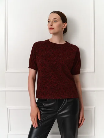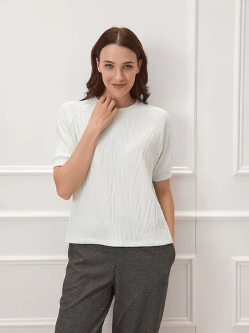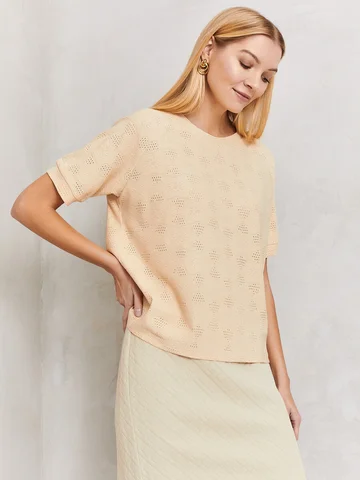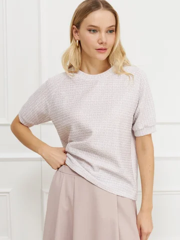 Джемпер с короткими рукавами реглан и круглой горловиной цвета топленого молока выполнен из мягкого трикотажа с ажурным принтом. Эластичный материал отлично пропускает воздух, а одежда из него не пилингуется и не сковывает движения. Предлагаем создать образ с юбкой А-2113 ФРК(В4) или брюками Б-704 ВКР(В4).