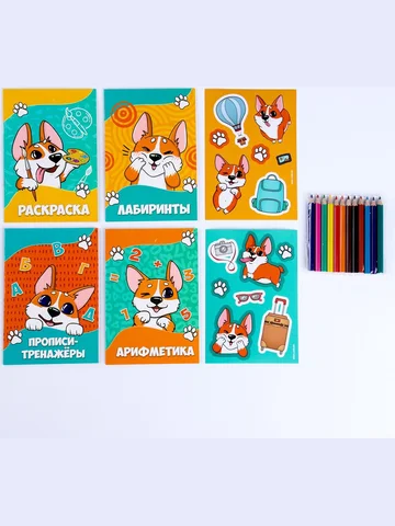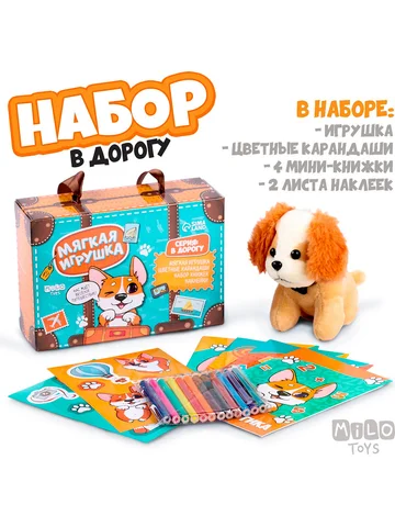 Набор в дорогу с мягкой игрушкой «Собачка», 8 предметов. Набор в дорогу «Собачка» — это идеальный компаньон для маленьких путешественников. В комплекте 8 предметов, включая мягкую игрушку, цветные карандаши, мини-книжки и наклейки. Стильная подарочная коробка делает его готовым решением для любого праздника или особого случая. Особенности
