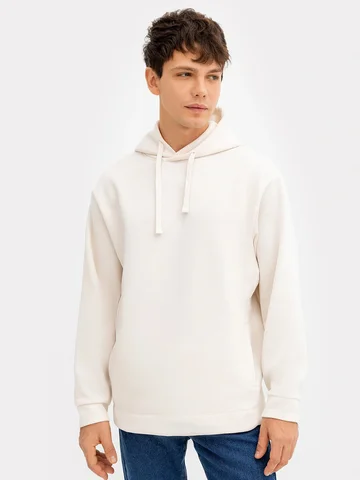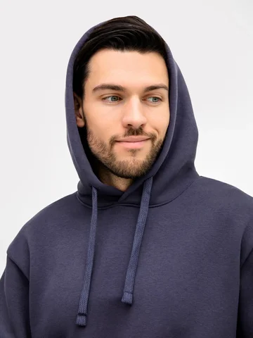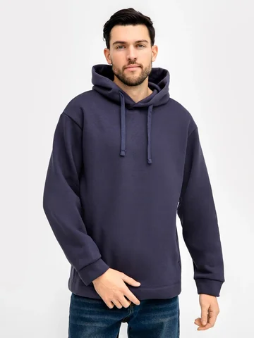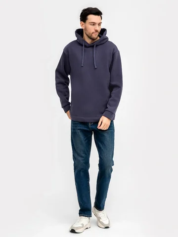 Стильное и теплое мужское худи прямого силуэта. Выполнено из трикотажного футера с теплым подчесом. Горловина круглая, с уютным капюшоном, который спереди идет внахлест. Рукава длинные, на манжетах. Есть вместительный карман-кенгуру. Слегка спущенная линия плеча и немного углубленная пройма дарят свободу движений. Отличное худи для стильных образов!