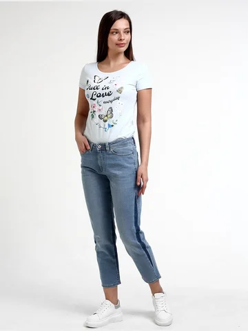 Женские модные джинсы с пятью карманами. Посадка Boyfriend fit. Для улучшения посадки по талии сделан подкройной пояс из 2-х частей. Застежка на молнии. Высокая посадка по талии, зауженные к низу, укороченной длины. Длина внутреннего шва для роста 32 - 69, 0 см. Боковой шов "в разутюжку". По боковому и внутреннему швам сделана имитация вставок темной джинсовой ткани. Выполнены из слабоэластичной ткани denim comfort stretch. Светлая стирка с потертостями и "усами"спереди и потертостями сзади. Параметры указаны для размера 28.