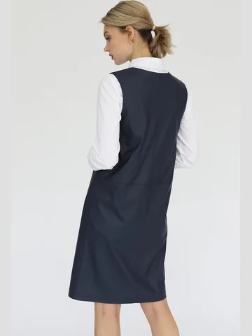 Сарафан из экокожи с круглым вырезом горловины и вытачками по линии груди. Сарафан состоит из 4-х частей и отстрочен по швам отделочной строчкой.