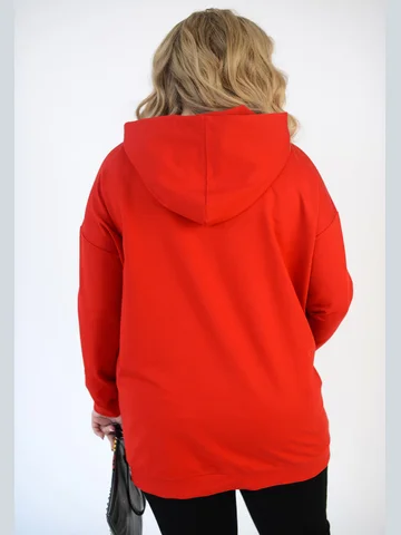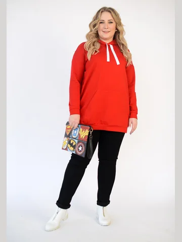 Состав: 95% хлопок, 5% лайкра.Материал: трикотаж футер двухнитка петля. Цвет: красный. Рукав: длинный/ втачной одношовный с манжетой. Спущенное плечо. Силуэт: прямой. Длина изделия:ниже бедра. Воротник: круглый. Втачной капюшон со шнурком. Особенности модели:Перед с накладными карманами по центру. Низ изделия на притачном поясе. Изделие без подклада. Параметры модели: ОГ114/ОТ96/ОБ130,5. Рост модели 176см. Размер 58. В образе используются: Джинсы Б460-2