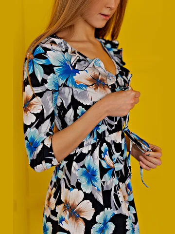 Повседневное, очень удобное и практичное универсальное платье с рукавом 3/4. Рюши на груди и волан по подолу создают романтичный образ. Изготовлено из ткани - кулирка.
