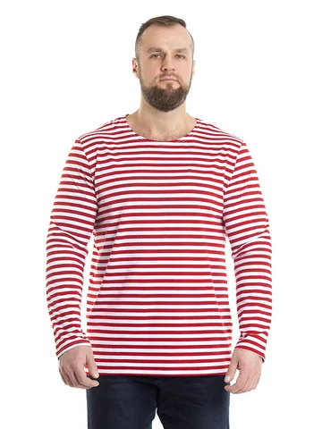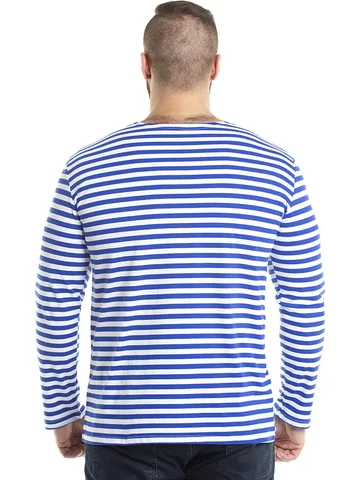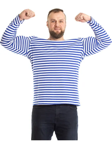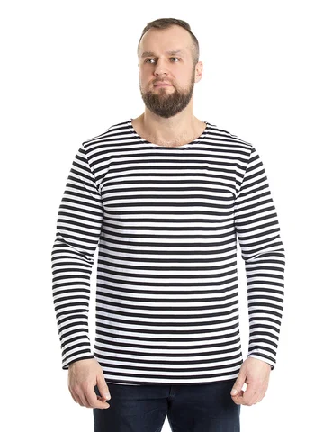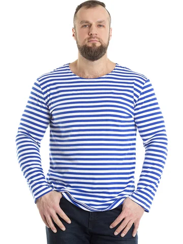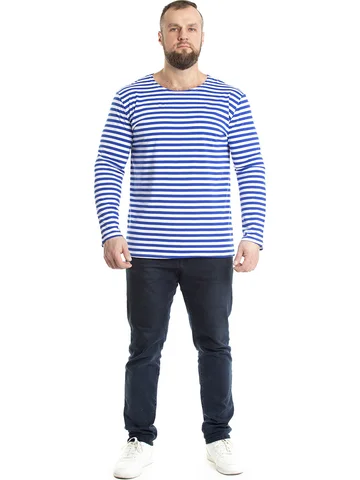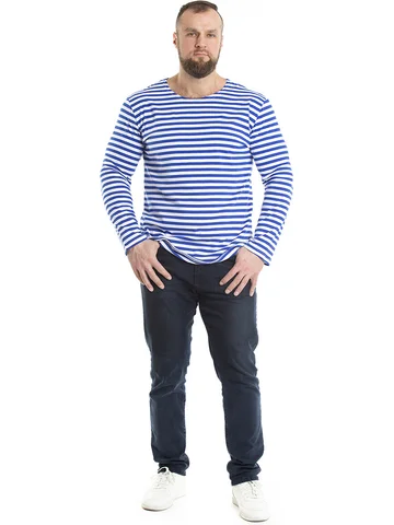 Тельняшка мужская в синюю полоску - изготовлена из трикотажного кулирного полотна. Полоска - вывязанная, а не печатная, а это значит, что рисунок не будет стираться. Тельняшка станет вашей любимой частью гардероба. Лонгслив домашний идеально подходит для повседневного образа. Он отлично смотрится как с джинсами, так и с трико. Легкая ткань позволяет коже дышать, обеспечивая комфорт в любое время года. Хлопковый мужской лонгслив - незаменимая базовая вещь в гардеробе, для охотника и любителя рыбалки – одежда для настоящих мужчин. Такой хлопковый свитшот можно использовать, как нательное белье. Лонгслив в полоску можно носить под свитер или любую другую одежду, либо как отдельный предмет гардероба. Такая одежда для мужчин уместна в самых разных ситуациях: для занятий спортом и спортивных тренировок на свежем воздухе. Хороша эта вещь в путешествиях, а также на отдыхе. Кофта трикотажная с полосатым принтом всегда признанный и популярный товар у мужчин. Этот лонг белый с синими полосками станет универсальным решением для вашего летнего гардероба. Он прост в сочетании с другими предметами одежды, позволяя создавать разнообразные образы. Такой лонгслив мужской домашний отлично дополнит любые брюки и обувь. Тельняшка с длинным рукавом больших размеров подарит комфорт даже самым требовательным мужчинам. Армейская одежда всегда привлекает внимание своей практичностью и стилем, а такой вариант лишь подтверждает эти качества. Базовая мужская кофта в полоску станет хорошим выбором для подарка мужчине на 23 февраля.