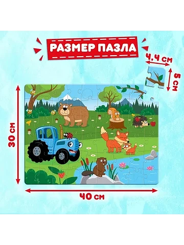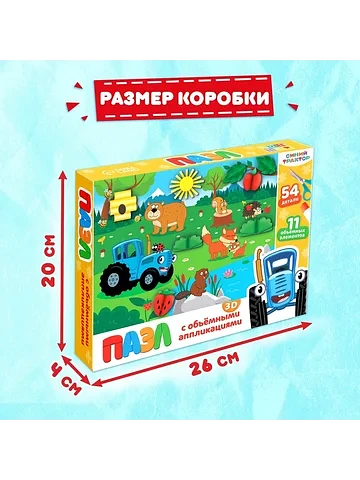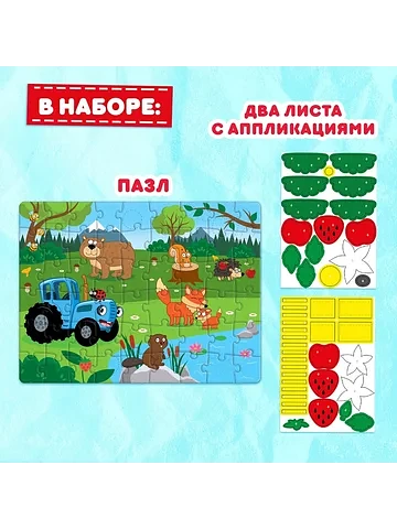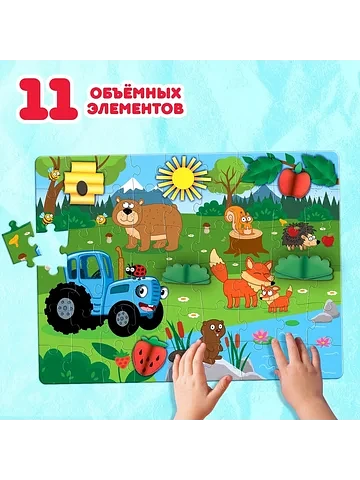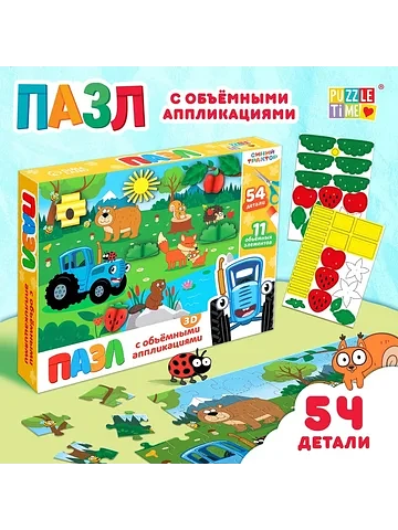 Пазл с аппликациями «Синий трактор на лесной опушке», 54 детали. Пазл с аппликациями «Синий трактор на лесной опушке» — это занимательная развивающая игра в новом формате. Игра с объемными аппликациями положительно влияет на развитие мелкой моторики рук, пространственного мышления и воображения. Малыш соберет все 54 детали в одно целое и украсит получившиеся изображение цветными аппликациями. Особенности пазла