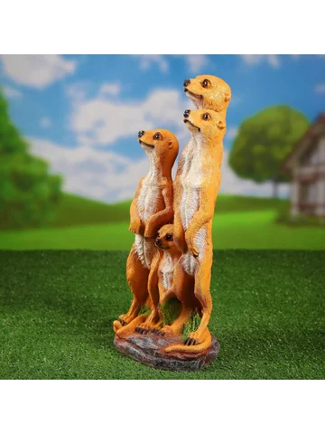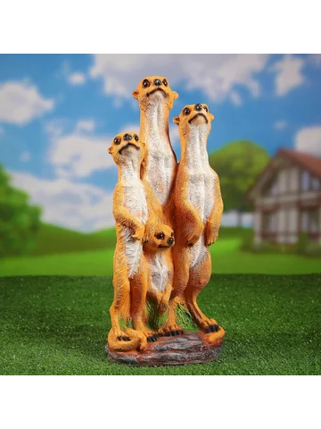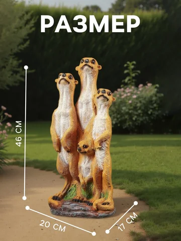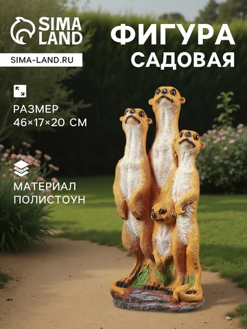 Садовая фигура из полистоуна «Сурикаты четверка», 46×17×20 см. Садовая фигура — это всегда стильное и яркое решение для ландшафтного декора, который добавит уюта и индивидуальности дачному участку, саду, огороду или клумбе. С ее помощью можно оформить вход на участок, разграничить пространство, разметить дорожку, создать тематическую атмосферу и превратить сад в единую композицию (узнать, как это сделать, можно в статье 5 причин использовать садовые фигуры на даче ). Чтобы украшение радовало вас дольше, рекомендуем следовать Инструкции по уходу за садовыми фигурами .