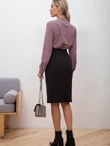 Офисная юбка-карандаш из плательно-костюмной ткани в полоску. Верх оформлен втачным поясом. В среднем шве спинки застежка на пуговицу и потайную молнию. Модель на подкладе. Низ ровный, сзади шлица.
