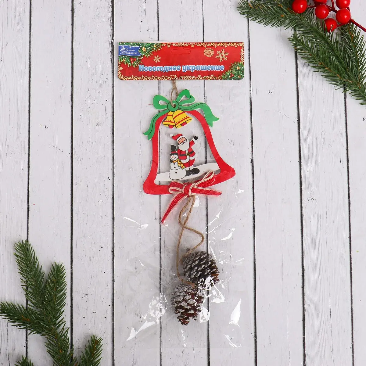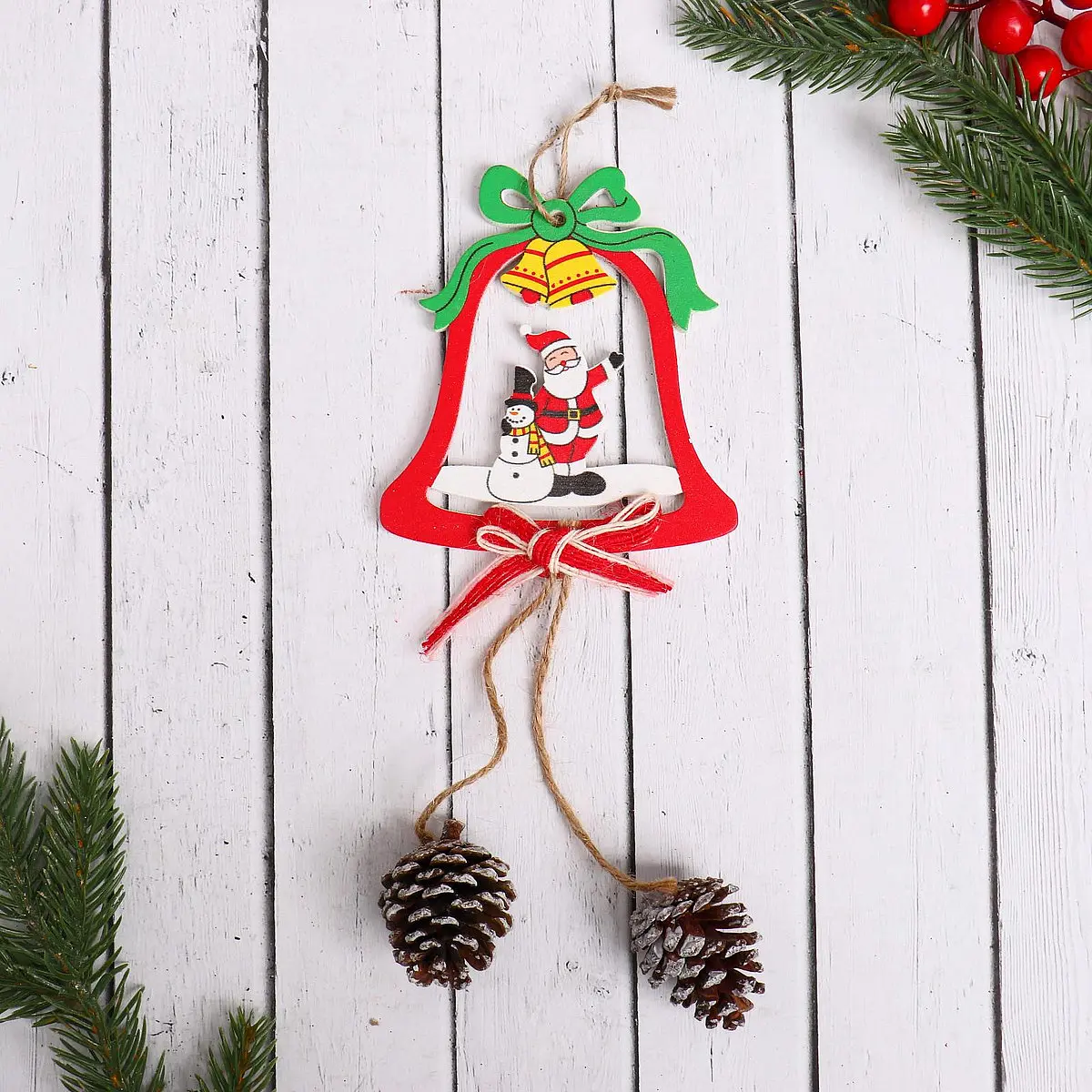 Ёлочная игрушка «Колокольчик с шишками» Дед Мороз и снеговик 9×24 см. Деревянный колокольчик с резной отделкой в красном цвете объединяет элементы советского и фьюжн стилей, изображая Деда Мороза и снеговика среди шишек. Эта елочная игрушка станет выразительным акцентом в праздничном оформлении, добавляя традиционную теплоту и современную изюминку одновременно. Особенности