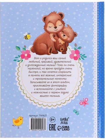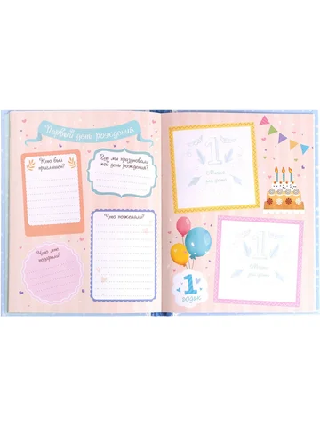 Альбом любимого сыночка «Мой первый годик», 48 стр.. Сохраните все важные и трогательные моменты первого годика жизни вашего малыша. Записывайте в альбом все, что происходит с крохой в это время. Когда в первый раз улыбнулся? Какое было его первое слово? Фиксируйте забавные случаи, первые фразы, вклеивайте фотографии, чтобы потом вместе с подросшим малышом прочитать эту книгу-альбом. В книге есть место для 32 фото разного размера: от 2 × 4 см до 12 × 8 см.