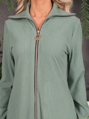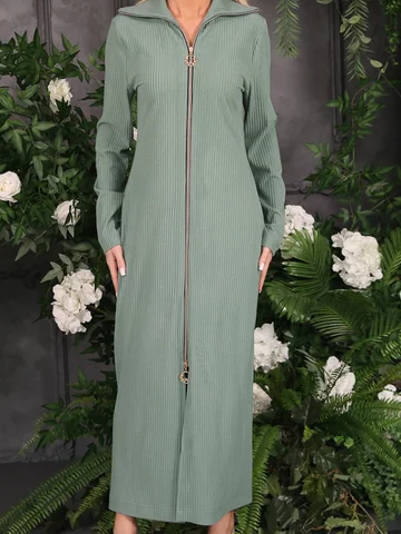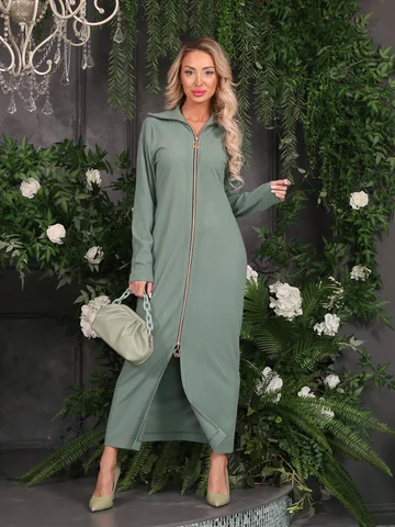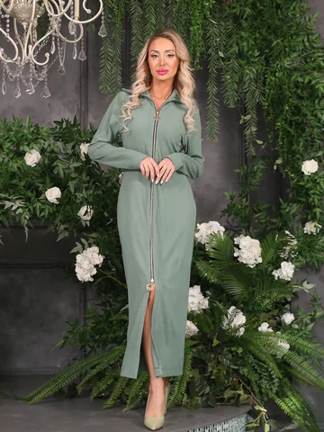 Стильное платье полуприлегающего силуэта из трикотажного полотна мятного цвета. Платье с отложным воротником. Застежка по переду изделия на металлическую молнию. Платье со спущенной проймой и втачными рукавами. Длина изделия по спинке от плечевого шва до низа изделия — 129 см. Рост фотомодели — 170 см.