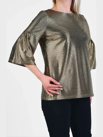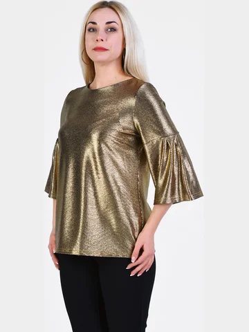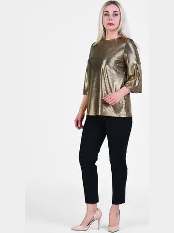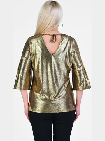 Праздничная нарядная блузка из блестящего тонкого трикотажа с отрезным рукавом-колокол длиной 3/4, высокой округлой горловиной и соблазнительным V-образным вырезом на завязках на спине. Крой изделия зрительно делает изящнее запястья, подчеркивает высоту груди. Модель подойдет чувственным элегантным красавицам, которые любят быть в центре внимания. Длина изделия по спинке от 65см в р.48 до 70,5см в р.70, длина рукава 45см.