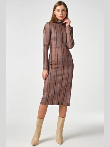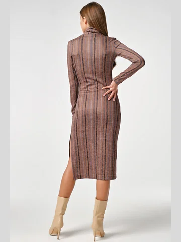 Особенности: Платье прилегающего силуэта из плотного трикотажа. Детали: высокий воротник-стойка втачной рукав разрез в боковом шве. Без застежки.