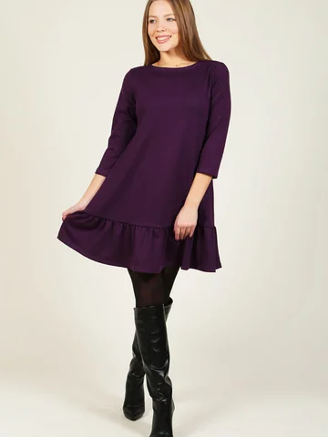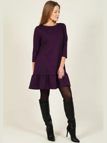 Ярко баклажанный оттенок – это тренд предстоящего сезона. Длина рукава ¾ добавит девушке строгости, а поэтому вещицу можно использовать как рабочий дресс-код. Но воланы по подолу наряда внесут немного мягкости в однообразные будни. Платье хорошо смотрится с темными сапогами, куртками и небольшими сумочками.