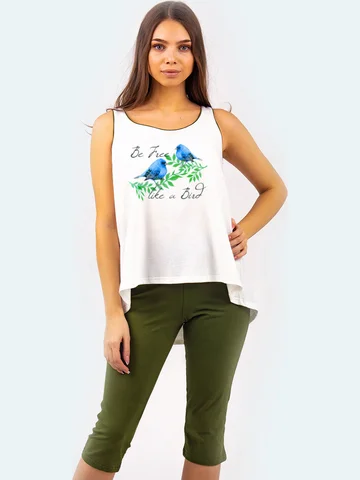 Удобный и практичный домашний костюм. В комплект входит просторная туника оригинального кроя,без рукавов, украшенная принтом и бриджи. Такой костюм подойдет как для дома, так и для отдыха.