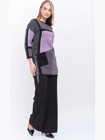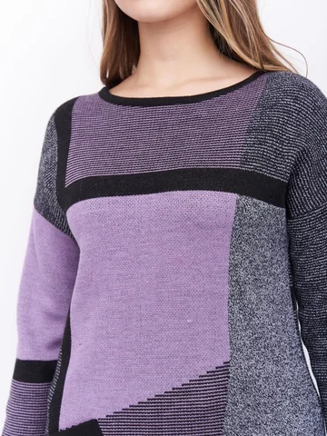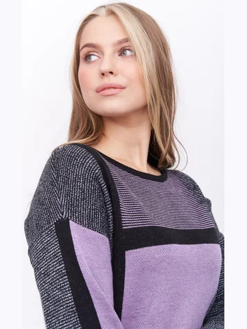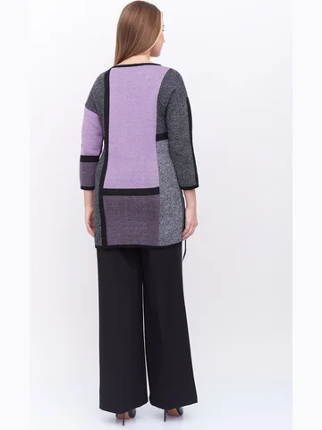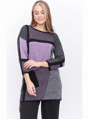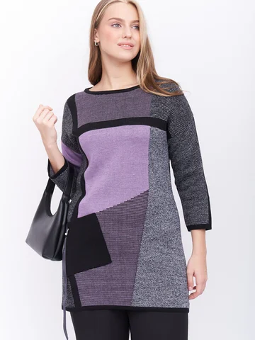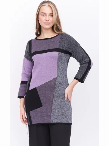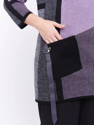 Удлиненный джемпер полуприлегающего силуэта с круглой горловиной, выполнен в оригинальном цветовом решении. Рукав 3/4. Полочка, спинка и рукава выполнена в жаккардовом переплетении с контрастным геометрическим рисунком. Накладной карман с декоративной тесьмой.