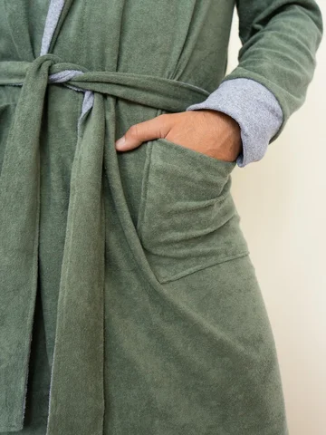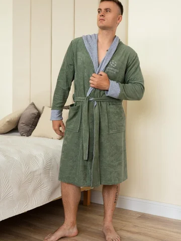 Махровый домашний мужской халат для отдыха и после водных процедур. Красивый и стильный халат с капюшоном, накладными карманами, манжетами и креплением на пояс. Необходимая вещь после трудных рабочих будней, в нем также можно с комфортом отдохнуть и расслабиться после бани или душа.