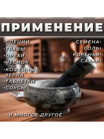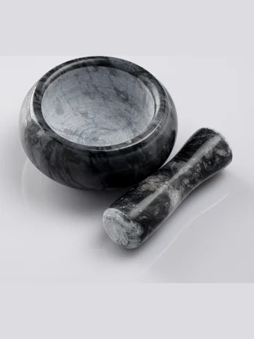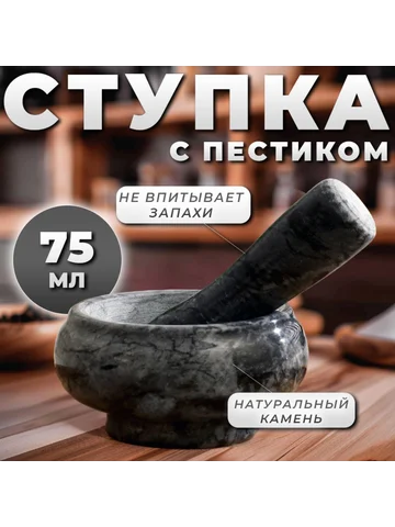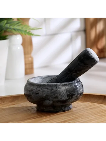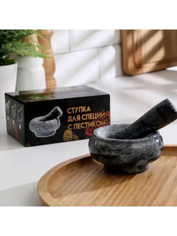 Ступка с пестиком, 75 мл, d=8 см, h=5 см, пестик 9 см, камень, черная. Мини-ступка из мрамора — для тех, кто готовит с акцентом на детали. Ее компактный объем и широкая чаша делают ее удобной для быстрого помола небольших порций: свежемолотый перец к стейку, щепотка растертого тмина в суп или капля пасты из имбиря и чеснока для маринада. Серый мрамор выглядит лаконично, не отвлекая от сути — точной работы с ароматами. Особенности