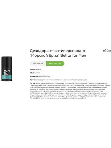 Belita For Men Дезодорант-антиперспирант Морской бриз 50мл. Объем 50 мл. Незаменимое средство против запаха и пота! Дезодорант-антиперспирант cоздан с учетом потребностей активных мужчин. Он обеспечивает максимальную защиту от пота, сохраняя сухость и великолепный запах в течение всего дня. Активный компонент (Д-пантенол) обладает смягчающими и увлажняющими свойствами. Он не только помогает сохранить свежесть и сухость подмышек, но и питает и ухаживает за кожей, делая ее мягкой и гладкой. Оставайтесь свежими и уверенными в себе весь день! Состав: Aqua (Water), Aluminum Chlorohydrate, Isododecane, Glyceryl Stearate, Ceteareth-20, Ceteareth-12, Cetearyl Alcohol, Cetyl Palmitate, PPG-15 Stearyl Ether, Cyclopentasiloxane, Dimethicone Crosspolymer, Tapioca Starch, Polymethylsilsesquioxane, Behenyl Alcohol, Dimethicone, Stearyl Dimethicone, Octadecene, Parfum (Fragrance), Polyacrylate Crosspolymer-6, Phenoxyethanol, Methylparaben, Ethylparaben, Propylparaben, Propylene Glycol, Ethylhexylglycerin, Octenidine HCI, Maris Sal, Palmaria Palmata (Algae) Extract, Ulta Enteromorpha (Algae) Extract, Himanthalia Elongata (Algae) Extract, Ulva Lactuca (Algae) Extract, Porphyra Umbilicalis (Algae) Extract, Panthenol, Isopropyl Myristate, Triticum Vulgare (Wheat) Germ Oil, Tocopheryl Acetate, BHT, Hexyl Cinnamal, Limonene, Linalool, Citronellol, Coumarin, Citral